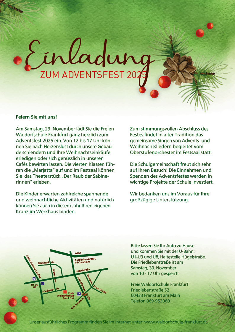 Die Freie Waldorfschule Frankfurt lädt zum diesjährigen Adventsfest ins geschmückte Schulhaus ein. Es wird wieder Cafés, Bistros und Stände mit Selbstgefertigtem sowie jede Menge Erlebnisse für kleine und große Kinder geben.