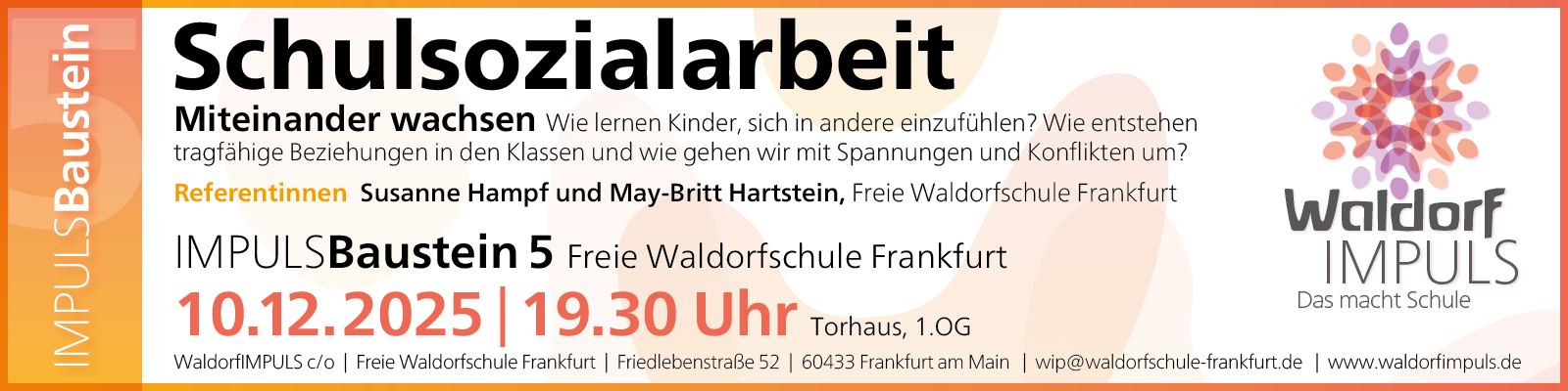 Die Freie Waldorfschule Frankfurt lädt zum diesjährigen Adventsfest ins geschmückte Schulhaus ein. Es wird wieder Cafés, Bistros und Stände mit Selbstgefertigtem sowie jede Menge Erlebnisse für kleine und große Kinder geben. Einladung Festprogramm ...