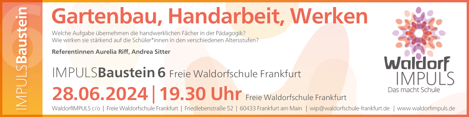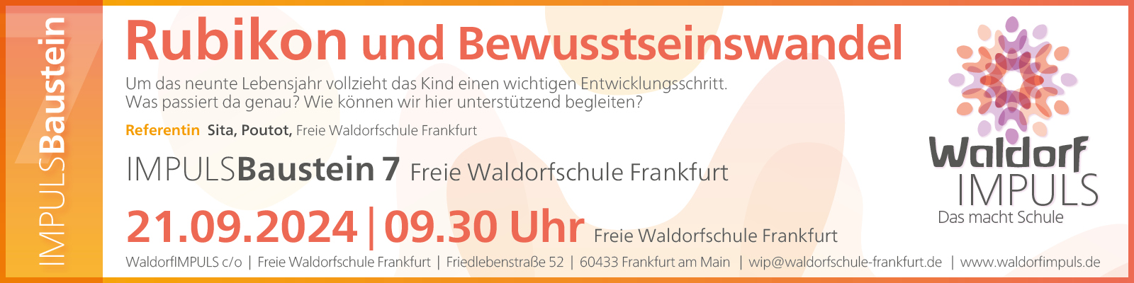 Rubikon und Bewußtseinswandel Um das neunte Lebensjahr herum vollzieht das Kind einen wichtigen Entwicklungsschritt. Was passiert da genau beim Kind bzw. in der Klasse? Wie können Eltern und Lehrende das Kind hierbei unterstützen und helfend begleiten? Hat sich in den letzten 100 Jahren etwas verändert? Samstag, 21.09.2024,...
